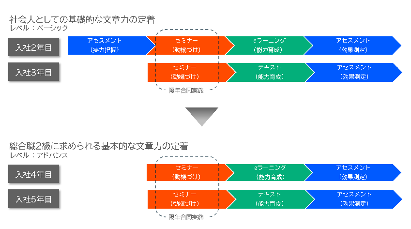 当社では漢検協会の「論理的文章力育成コンテンツ」を、入社2年目から5年目までの総合職を対象にした研修プログラムとして導入しています。まずは語彙・文法などの知識も必要となるベーシックレベルを学び、その後、最上級のアドバンスレベルへとステップアップする流れにしています。