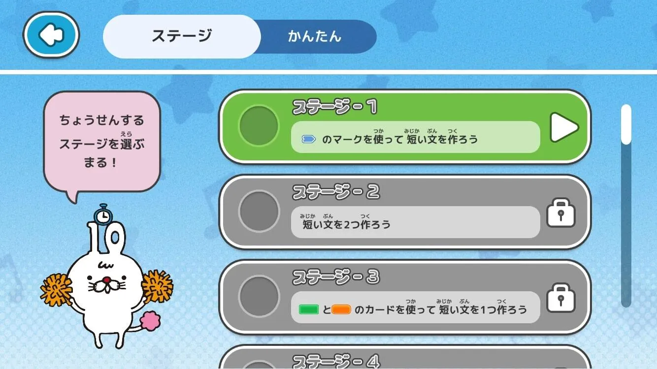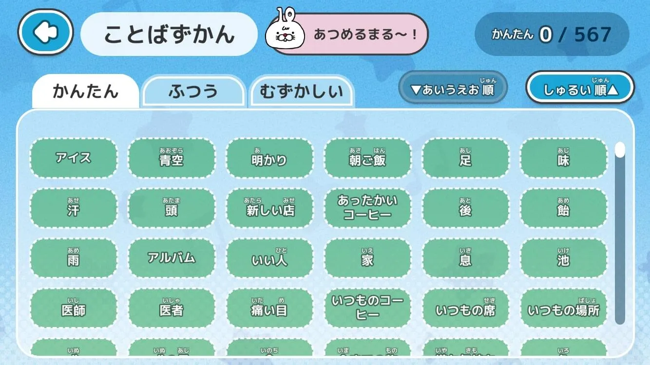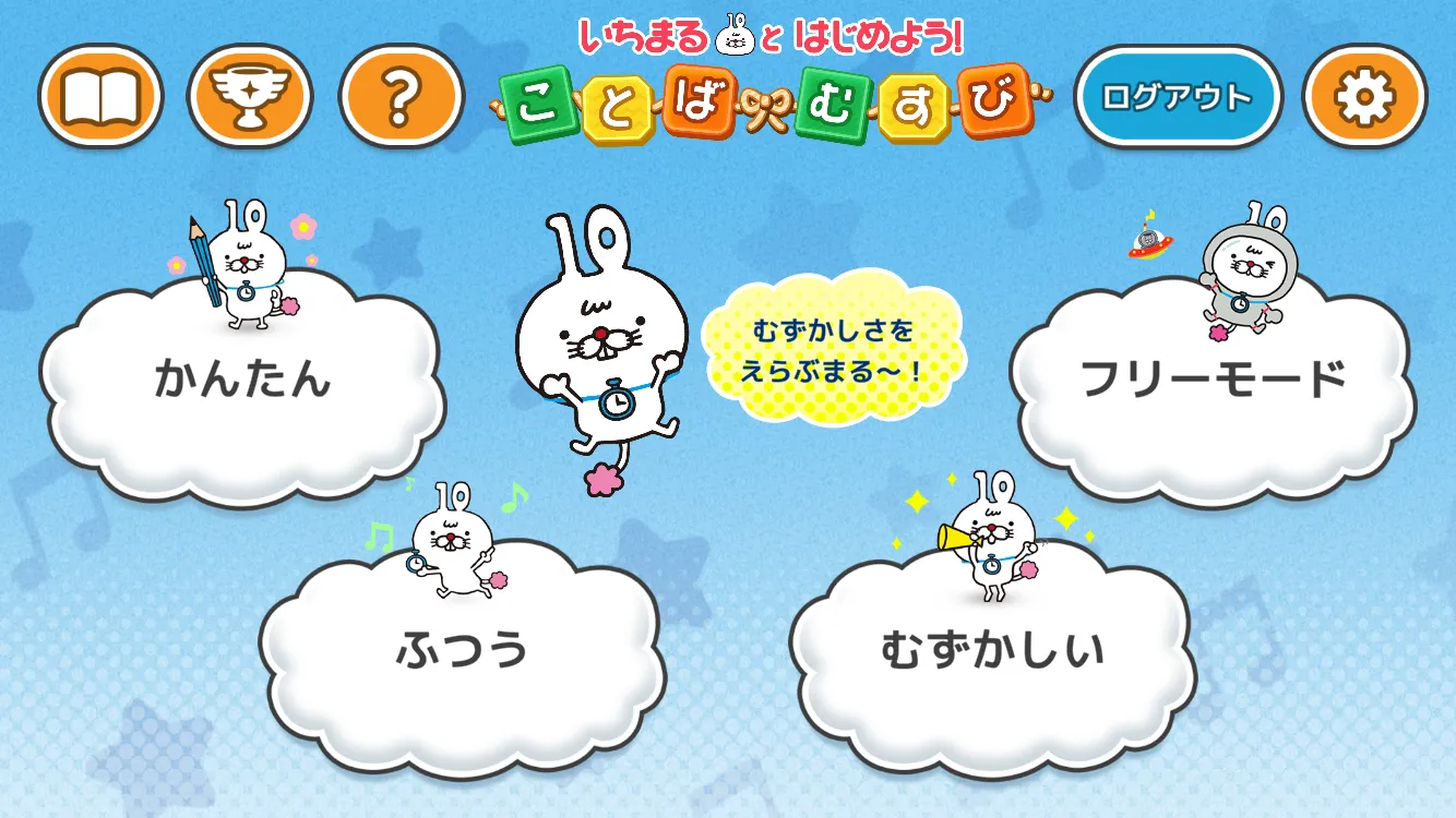 - 語の難しさにより3つのレベル(かんたん・ふつう・むずかしい)を選択可能